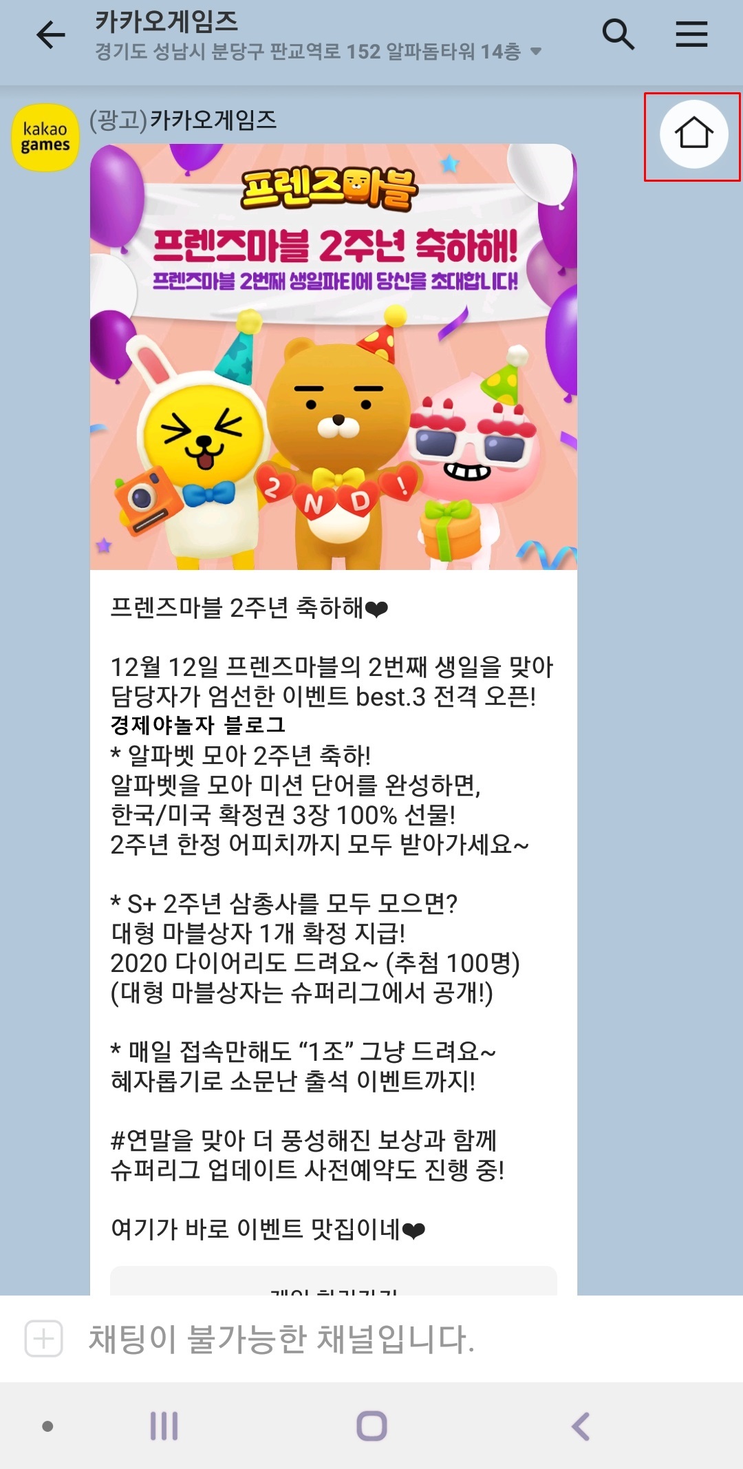 카카오 연계 게임을 하다보면 어느날부터 꾸준히 광고 메시지를 보내는 카카오게임즈입니다. 채팅방에 들어오셨으면 오른쪽위를 살펴보세요. 집모양의 버튼이 있을텐데 클릭해주시면 해당채널로 이동됩니다.